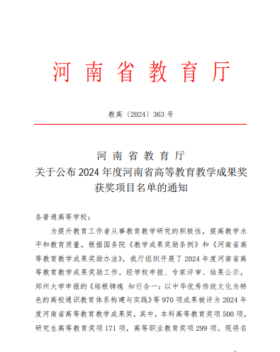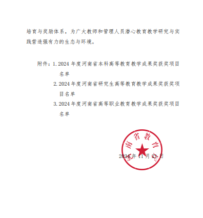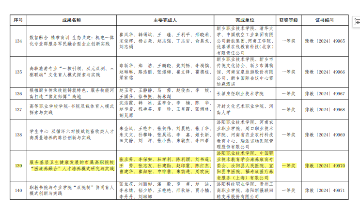 1 | 服务基层卫生健康发展的市属高职院校“医康养融合”人才培养模式研究与实践 | 张彦芳 | 河南省教育厅 | 2024.11 | 一等奖 |