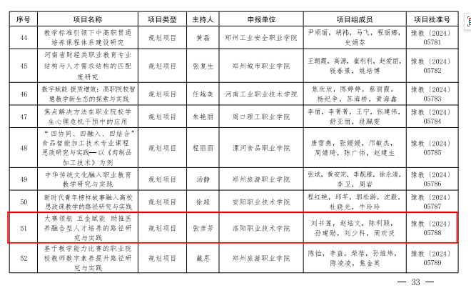 5 | 大赛领航 五金赋能 助推医养融合型人才培养的路径研究与实践 | 张彦芳 | 河南省教育厅 | 2024.02 | 在研 |