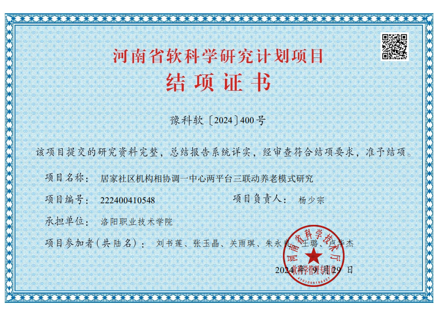 3 | 居家社区机构相协调一中心两平台三联动养老模式研究 | 杨少宗 | 河南省科学技术厅 | 2022.01 | 已结项 |