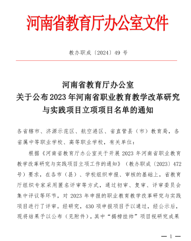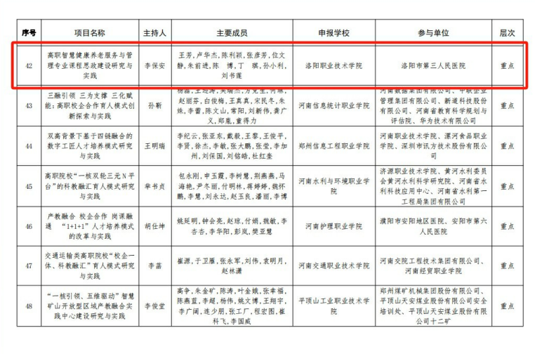 4 | 高职智慧养老服务与管理专业课程思政建设研究与实践 | 李保安 | 河南省教育厅 | 2024.01 | 在研 |