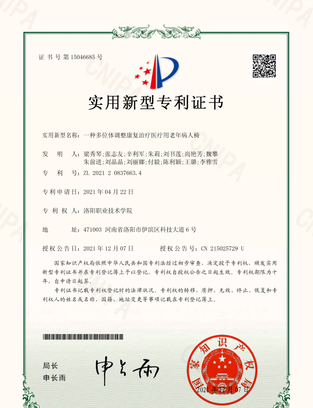 14 | 2021.04 | 一种多位体调整康复治疗医疗用老年病人椅 | 实用新型专利 | 梁秀琴 | 第一 |