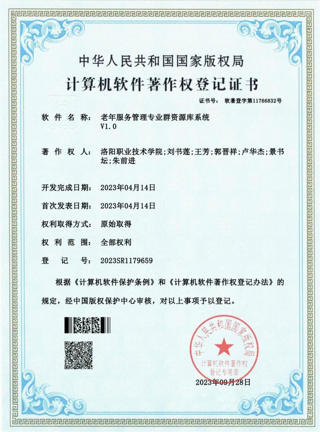 7 | 2023.09 | 老年服务管理专业群资源库系统V1.0 | 软著 | 刘书莲、王芳、 | 第一、第二 |