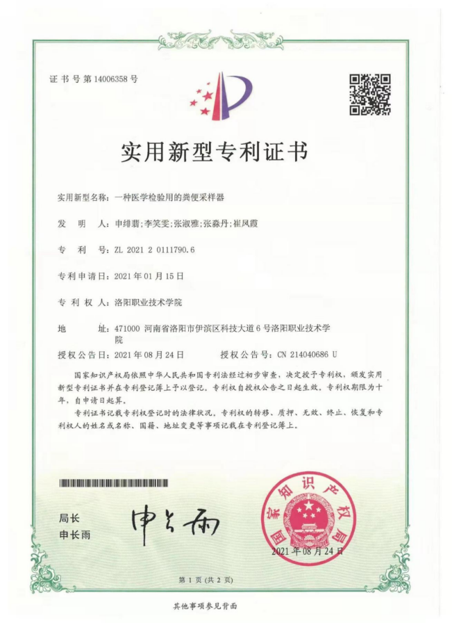 9 | 2021.08 | 一种医学检验用的粪便采样器 | 实用新型专利 | 申绯翡 | 第一 |