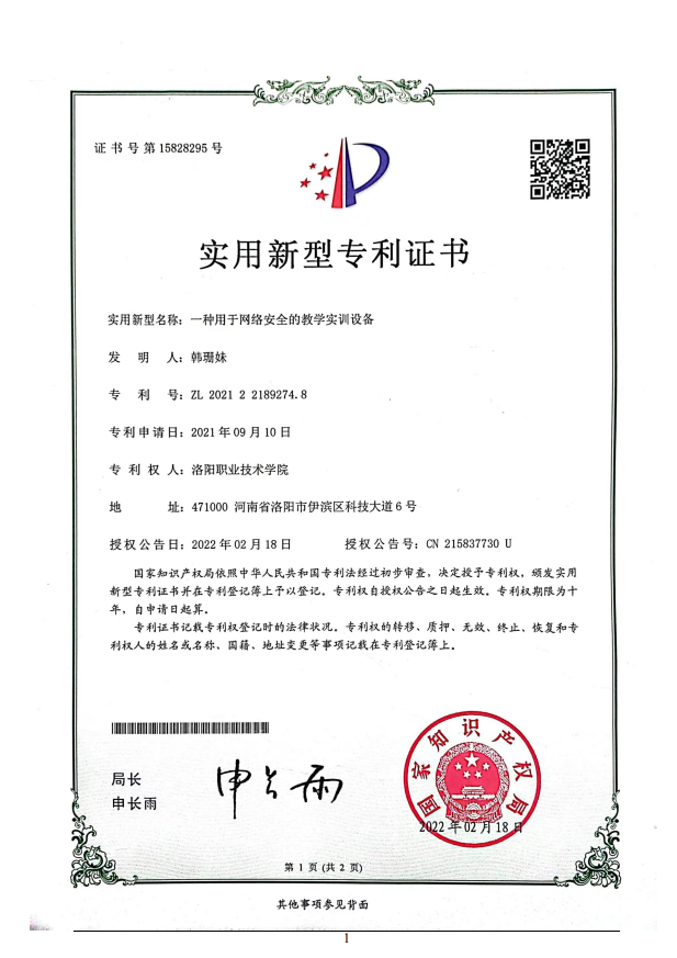 17 | 2022.02 | 一种用于网络安全的教学实训设备 | 实用新型专利 | 韩珊妹 | 第一 |