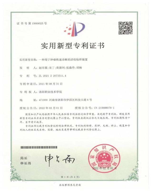 7 | 2022.01 | 一种用于肿瘤快速诊断的活检取样装置 | 实用新型专利 | 赵印震 | 第一 |