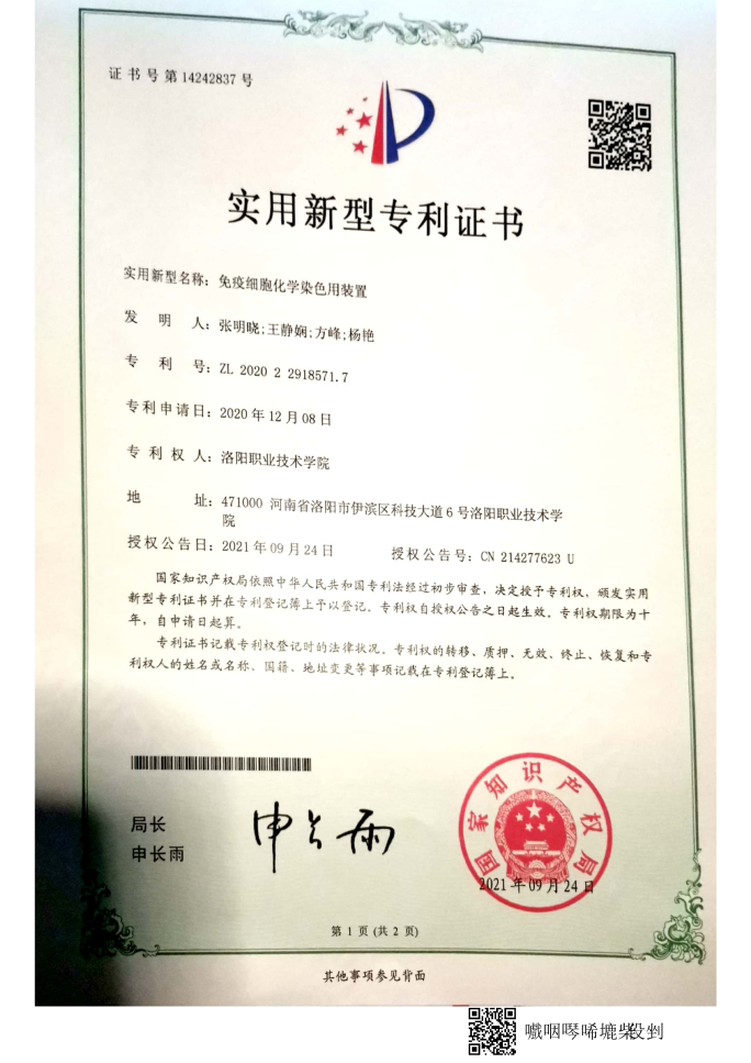 21 | 2021.09 | 免疫细胞化学染色用装置 | 实用新型专利 | 张明晓 | 第一 |