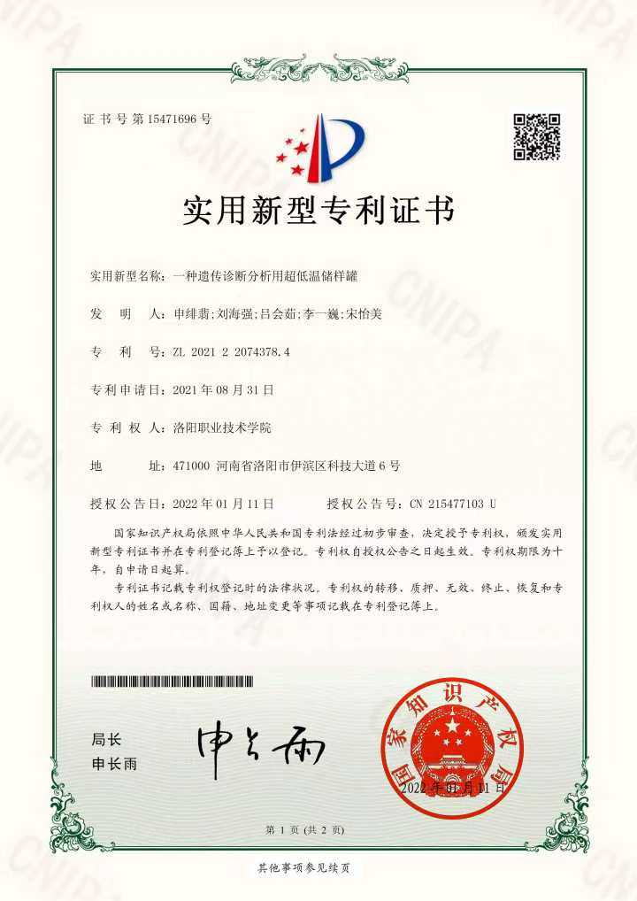30 | 2023.01 | 一种遗传诊断分析用超低温储样罐 | 实用新型专利 | 申绯翡 | 第一 |