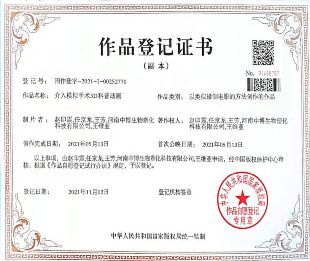 4 | 2021.11 | 介入模拟手术3D科普动画 | 软著 | 赵印震、王芳 | 第一、第三 |